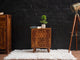 This retro Diamond Wooden TV Unit Cabinet is made of fine mango wood with a diamond pattern that reflects the light to make it look more attractive. The cabinet provides an open storage compartment, two doors, and a magnetic push-button drawer. The open storage compartment above the drawer offers additional space to display items.